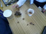 1年生が生活科の授業で、集めた松ぼっくりやどんぐりなどを使って楽しい遊具を作っていました。「見て、見て。うまくできました。」と、どんぐりのやじろべえを見せてくれました。