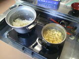 5年生の家庭科調理実習の様子です。「ごはんとみそ汁を同時に完成させよう」という学習課題に向けて、どのような手順で何をすればよいか、班で考えながら実習に取り組んでいました。効率よく調理を進めて、おいしい食事を味わっていました。