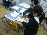 休み時間の様子です。雪と雨でぬかるんでいて校庭が使えないので、教室で工夫して遊びます。写真は1年生の教室で昔遊びをしているところです。上手にコマを回して手のひらに乗せていました。