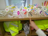 1年生が風車を作っていました。「ぼくが作ったのは、これ!」と教えてくれました。カラフルな風車がたくさんできていました。