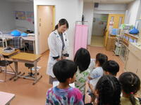 同じく1年生の生活科「学校たんけん」のインタビューの様子です。「こうちょうしつではどんなことをしていますか?」「きゅうしょくのじゅんびで、つかっているどうぐのおおきさをおしえてください。」「どうやってけがをしたひとをてあてしていますか?」など、一生懸命聞いて、メモをしていました。